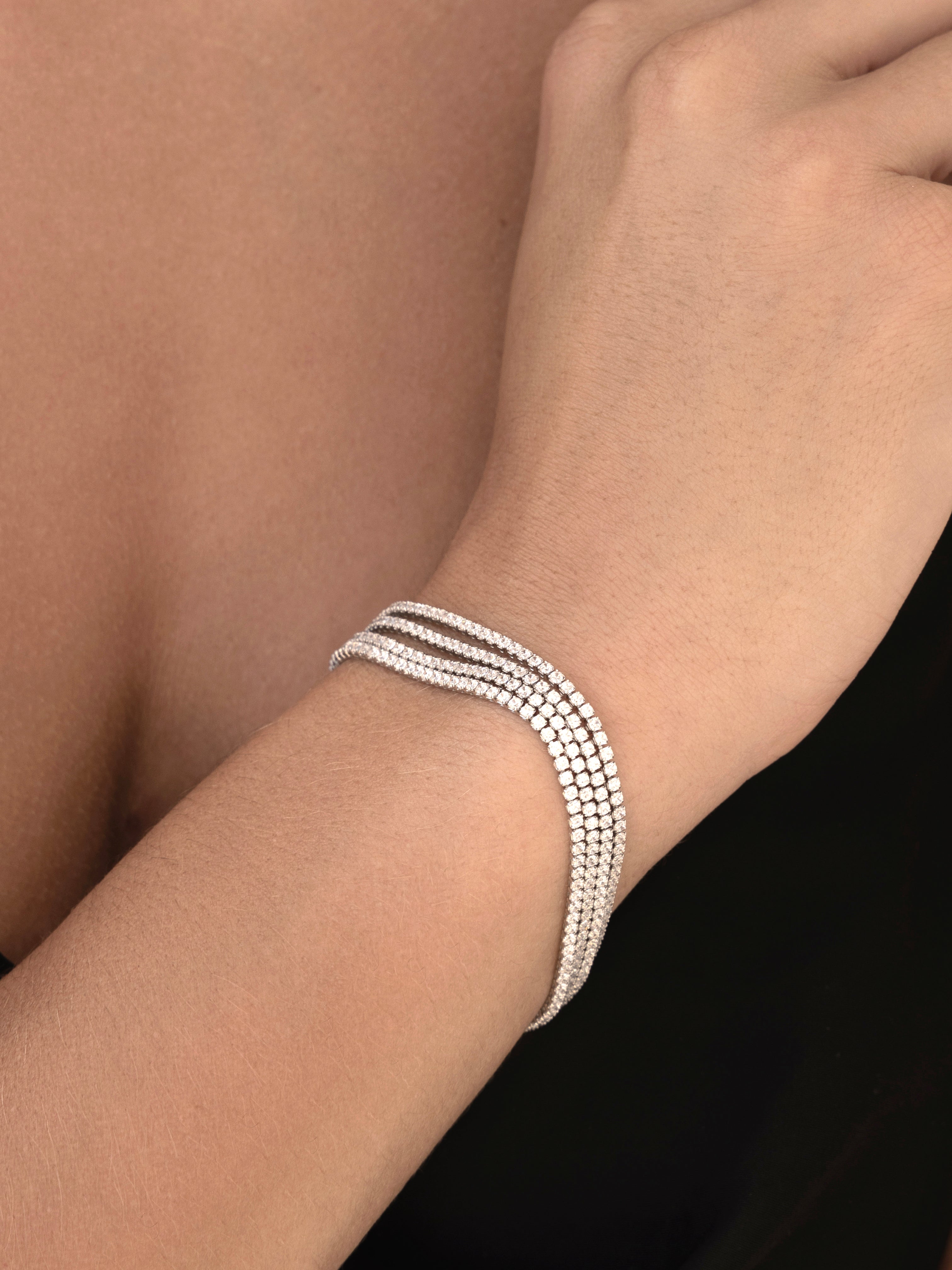 Elegant rhodium-plated bracelet featuring four rows of sparkling zircons. Available in two versatile sizes—16 cm and 18 cm—to suit different wrist measurements. The rhodium plating provides a lustrous, durable finish that resists tarnishing, while the zircon stones deliver brilliant sparkle and sophistication. Perfect for everyday elegance or special occasions.