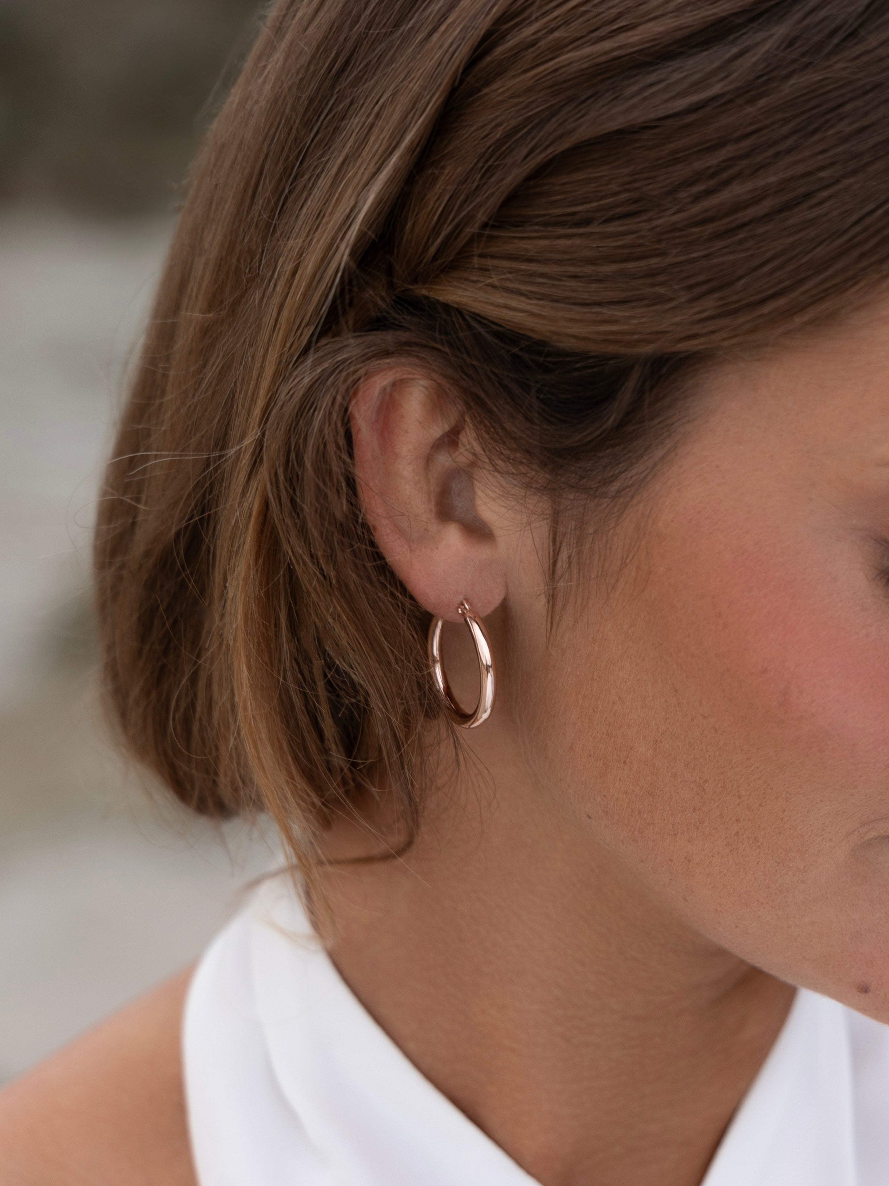 Šie 2.5 cm diametra cauruļveida auskari ir pārklātai ar rozā zeltu, tiem ir viegls dizains un droša angļu āķa aizdare, kas nodrošina ērtu valkāšanu.