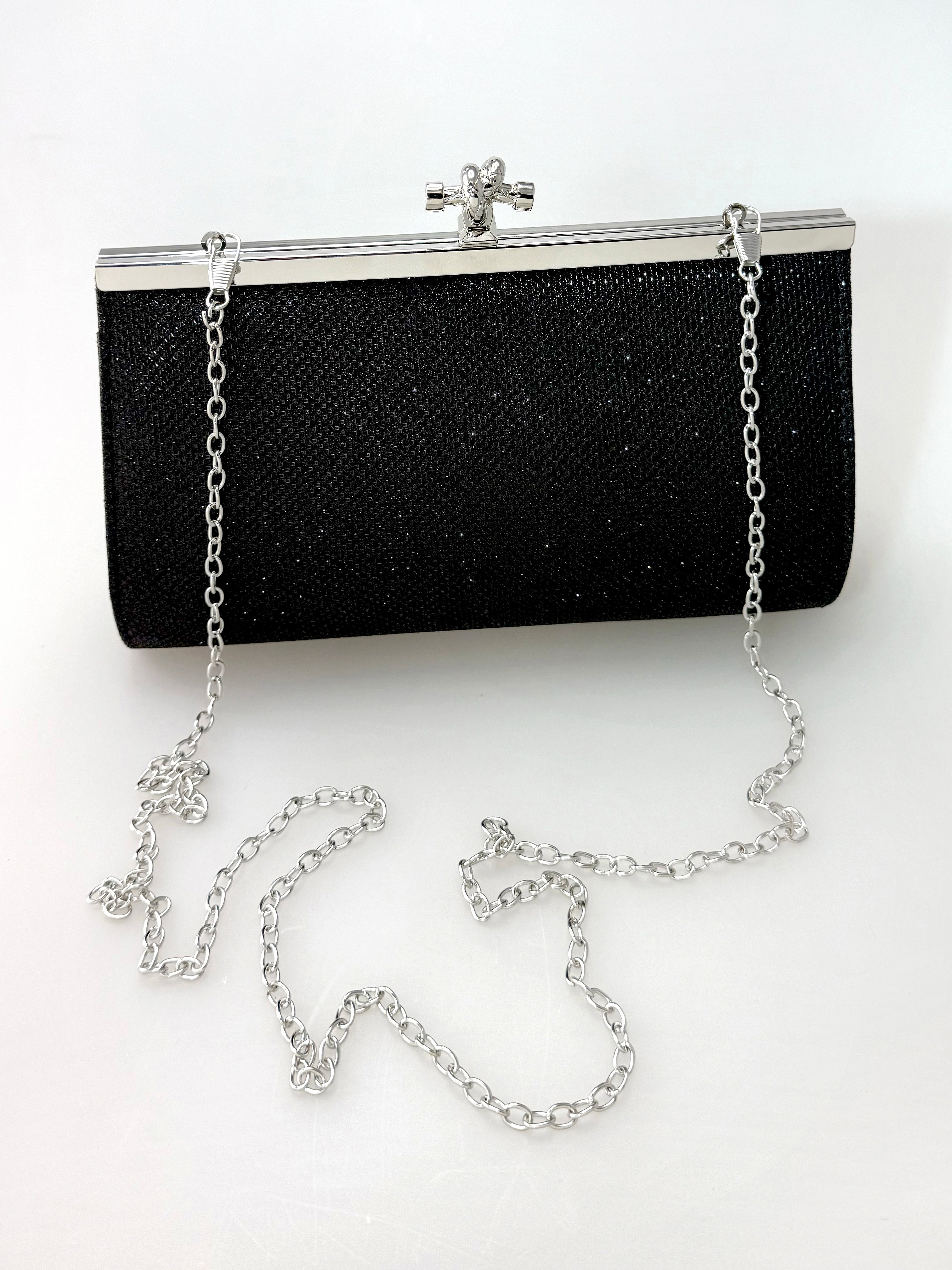 Noche somiņa ir izgatavota no grezna, melna, mirdzoša auduma. Šim elegantajam 21 x 13 cm aksesuāram ir noņemama 110 cm gara rodija ķēdīte, kas ļauj to nēsāt gan kā rokas klačiņu, gan kā pleca vakarsomu. Iekšējā kabata nodrošina ērtu nepieciešamo lietu glabāšanu. Ideāli piemērota vakara pasākumiem, svinībām un brīžiem, kad vēlaties mirdzēt.