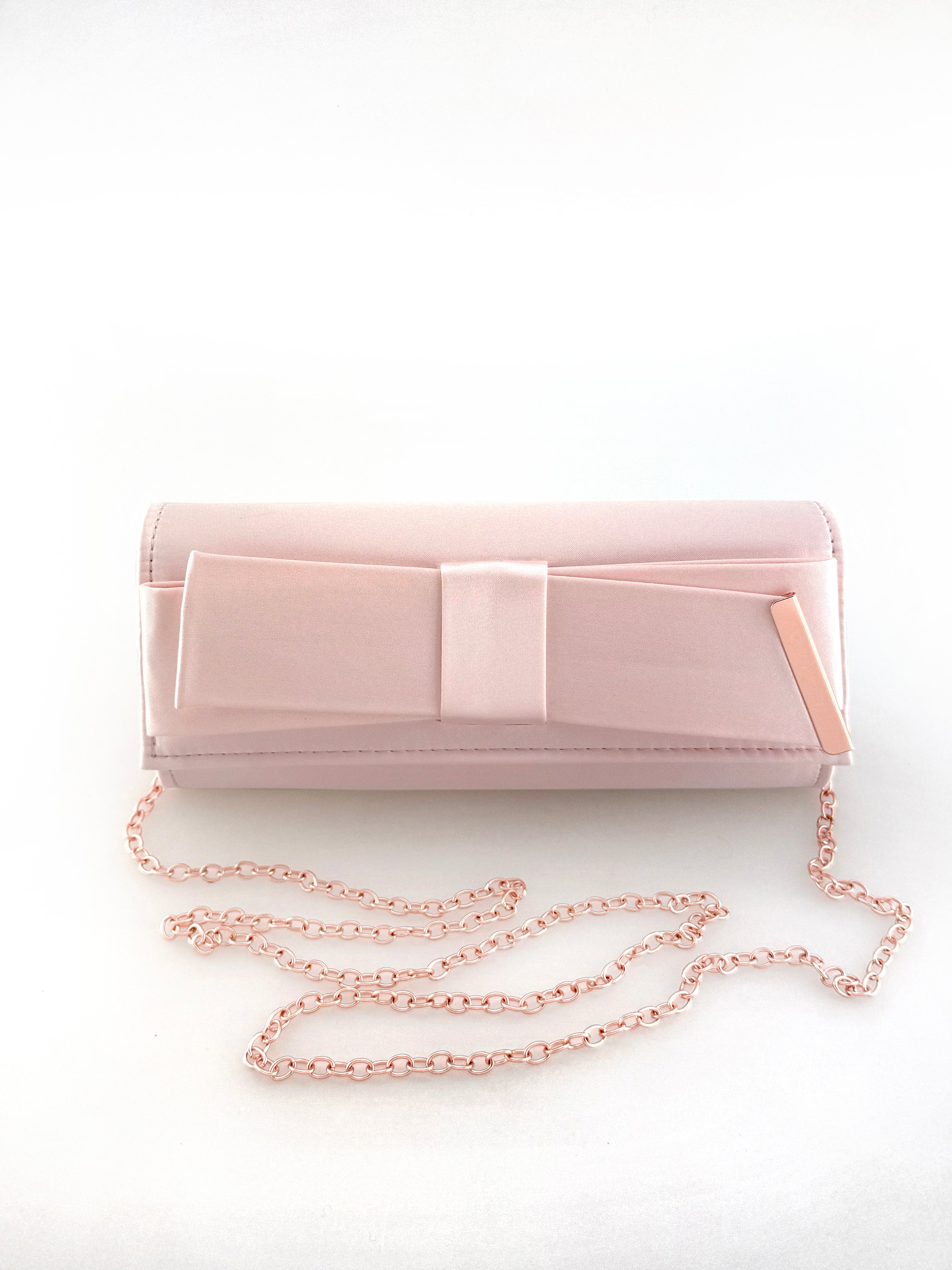 Rozā tonī satīna vakara soma, kuras izmērs ir 21 x 9 cm, ar ietilpīgu galveno nodalījumu un ērtu iekšējo kabatu svarīgākajām lietām. Komplektā ietilpst grezna rozā zelta krāsas ķēdes siksna (110 cm), ko var viegli noņemt, lai nodrošinātu daudzpusīgu stilu. Lieliski piemērota oficiāliem pasākumiem, kokteiļballītēm vai vakara iziešanai.