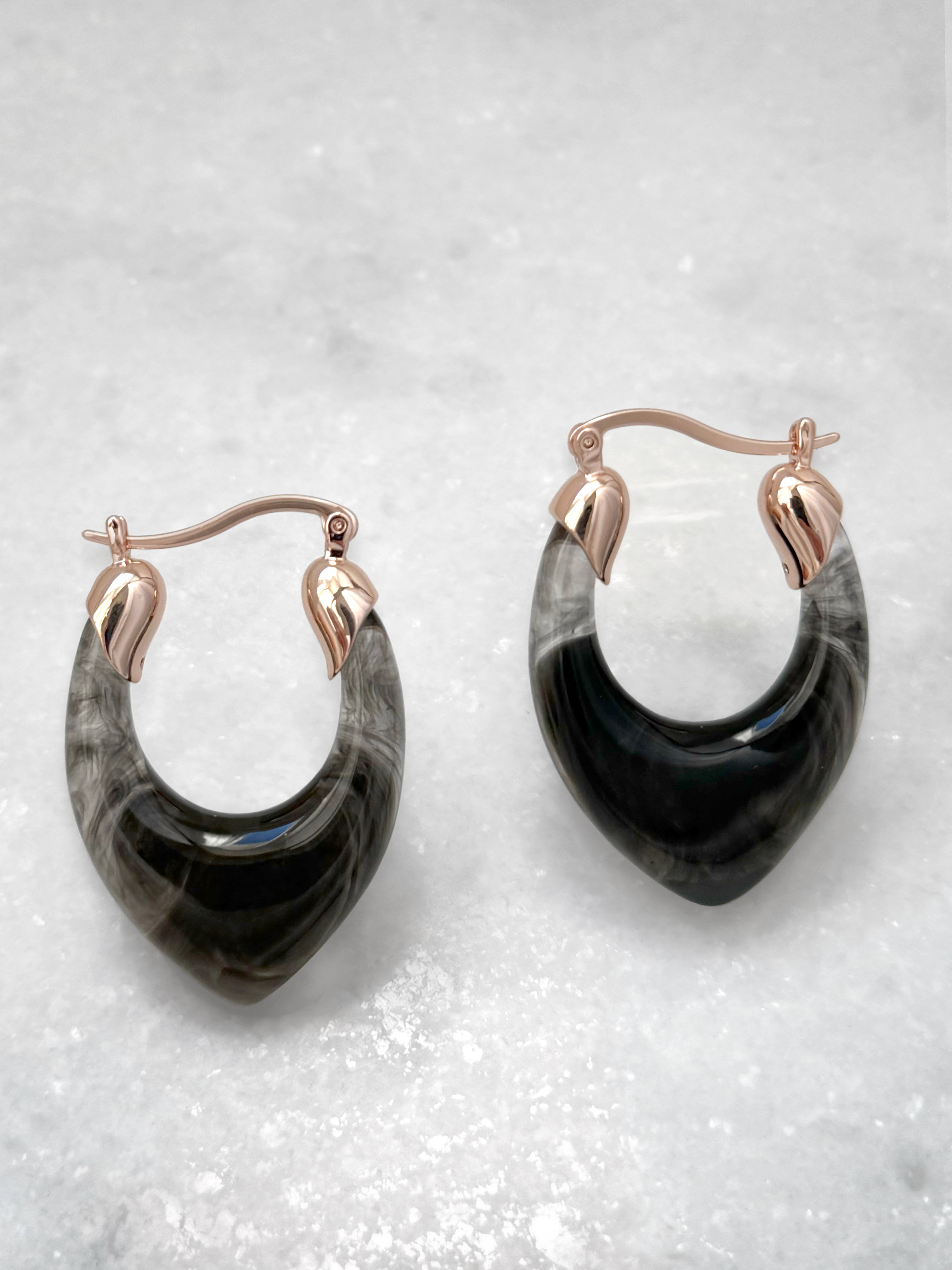 These Euphrates Earrings in black feature a delicate 4 cm length and a lightweight design, offering all-day comfort. Plated in warm rose gold with an elegant English hook, they bring an exotic touch to your look while remaining easy to wear and style. Perfect for adding subtle sophistication to any outfit.