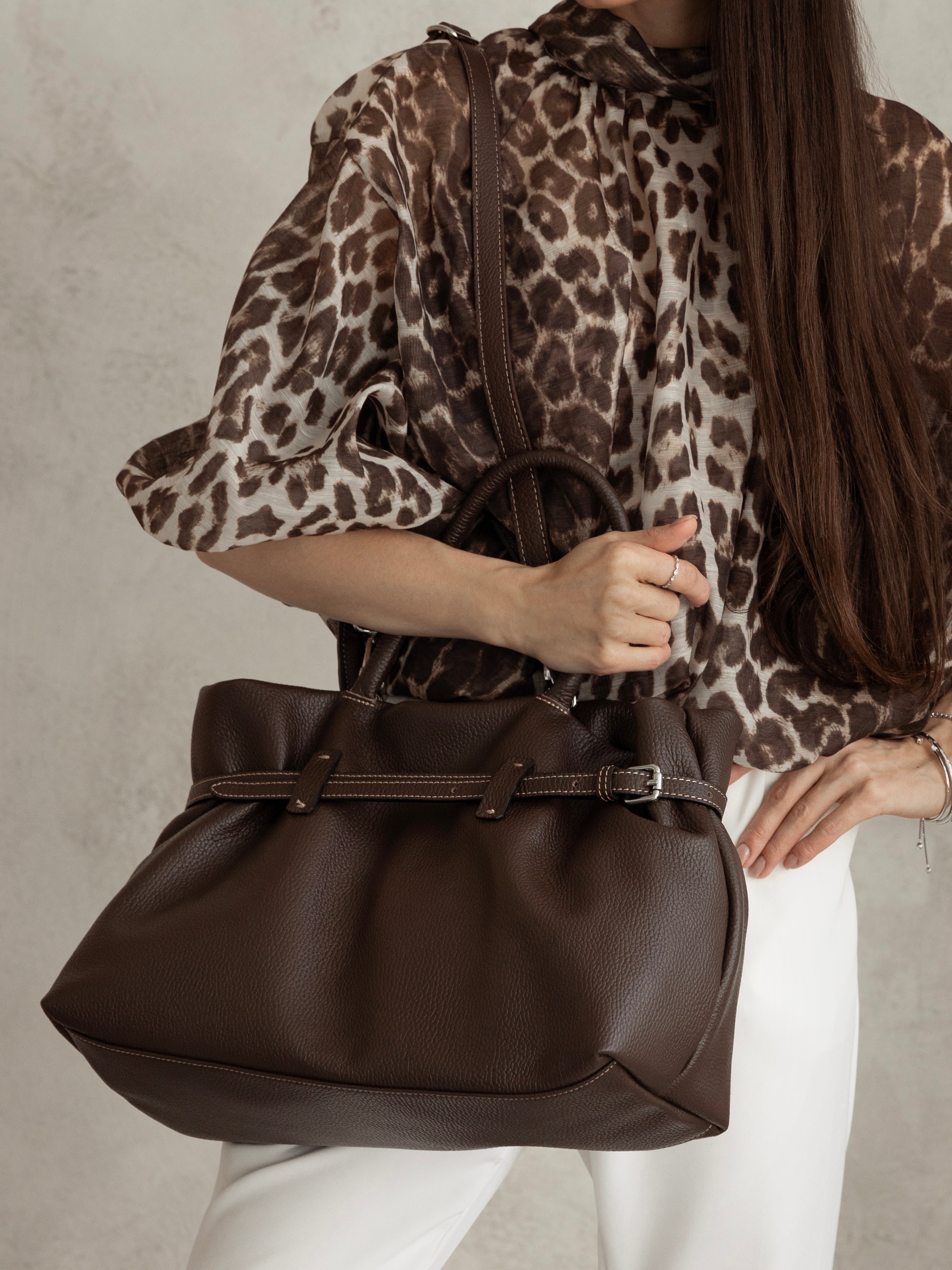 Crafted in Italy from soft real leather, the Savannah Bag in dark brown combines timeless style with functionality. It features one spacious main compartment and a zippered side pocket to keep your belongings secure and organized. With dimensions of 38 x 26 cm and a removable shoulder strap, this bag offers versatile comfort for everyday use.